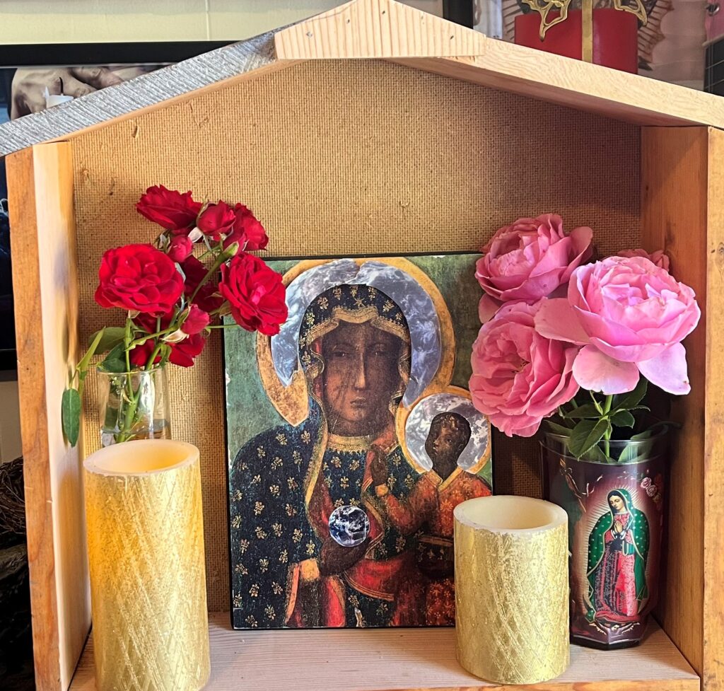P.S. The altar in the photo is not finished but I offer it as an example. The icon is our church logo, of the Black Madonna of Czestochowa which I altered. Please note my addition of the photo of the earth in the Madonna’s hand and as her and Jesus’ halo. We invite you to reimagine ancient symbols and how to transform them for The Secret Prayer Garden. I encourage you to experiment and try transforming ancient icons into altar art for our tree boxes. The Secret Prayer Garden is like the secret garden in Frances Hodgson Burnett’s brilliant book, The Secret Garden a place for beauty and healing love. Mary Lennox in the story finds the garden after it has been closed for many years. In a similar way our hearts have been closed for decades and centuries to the power of prayer and the invitation to have secret intimacy with God in our atheistic culture. We are called by God at this historic time to learn and commit to prayer practices and care for the natural world in radical love. May we follow Jesus and Mary Lennox into the Secret Prayer Garden to pray without ceasing.
