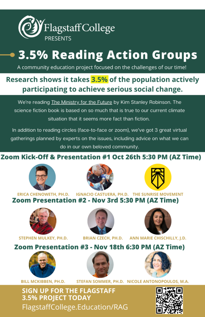 October 26-November 18, 2021: A community-wide reading-action project focused on the climate crisis. We’re reading Kim Stanley Robinson’s, The Ministry for the Future (face-to-face and online groups available) and gathering via Zoom for three in-depth presentations on topics related to the book. All are welcome to join. To sign up go to our website at www.FlagstaffCollege.education/rag. When 3.5% of the population actively engages, social change can happen!